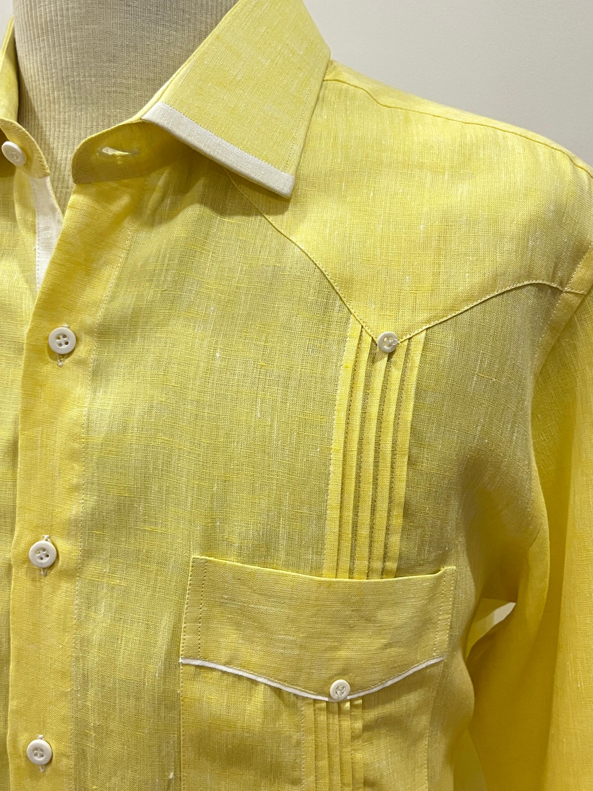 Guayabera color amarillo, vivos blancos,puño sencillo, botones blancos y descubiertos