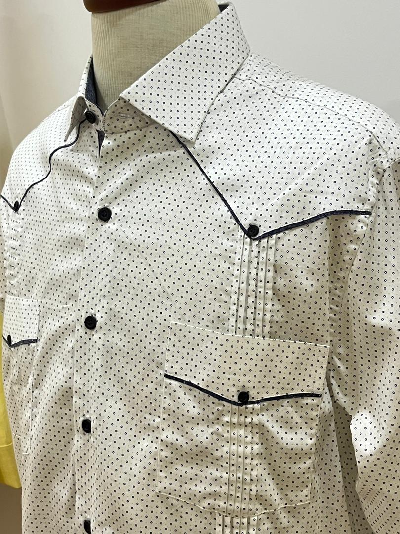 Guayabera de algodón, color blanco con puntos azul oscuro, vivos azul oscuro, puño sencillo botones azul marino y cubiertos