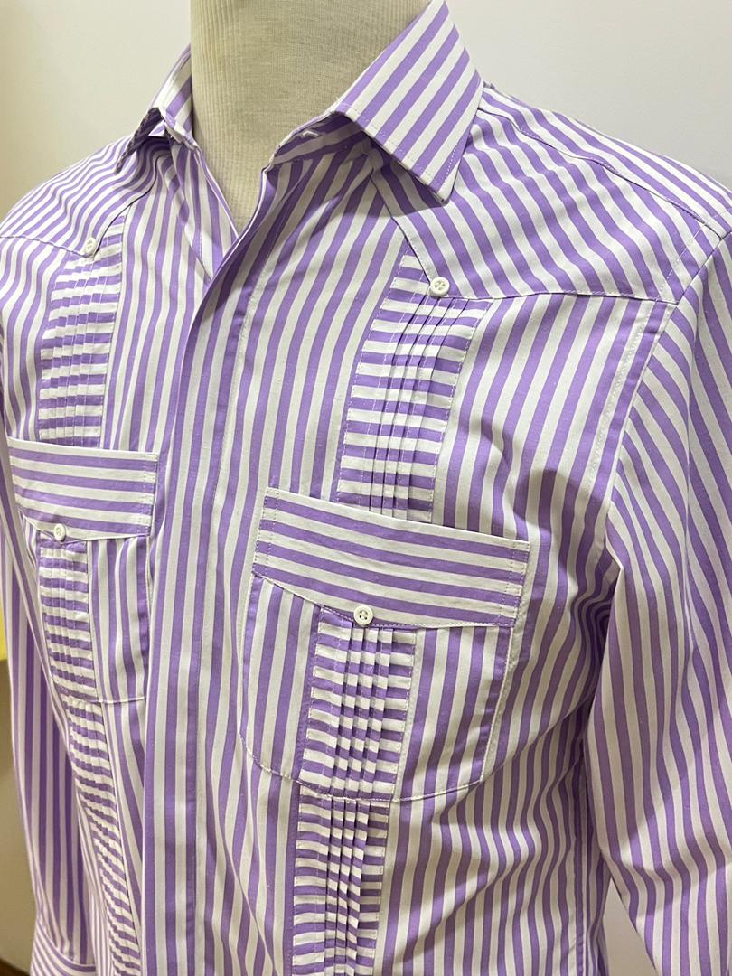 Guayabera de algodón con rayas moradas y blancas, puño sencillo, botones blancos y cubiertos.