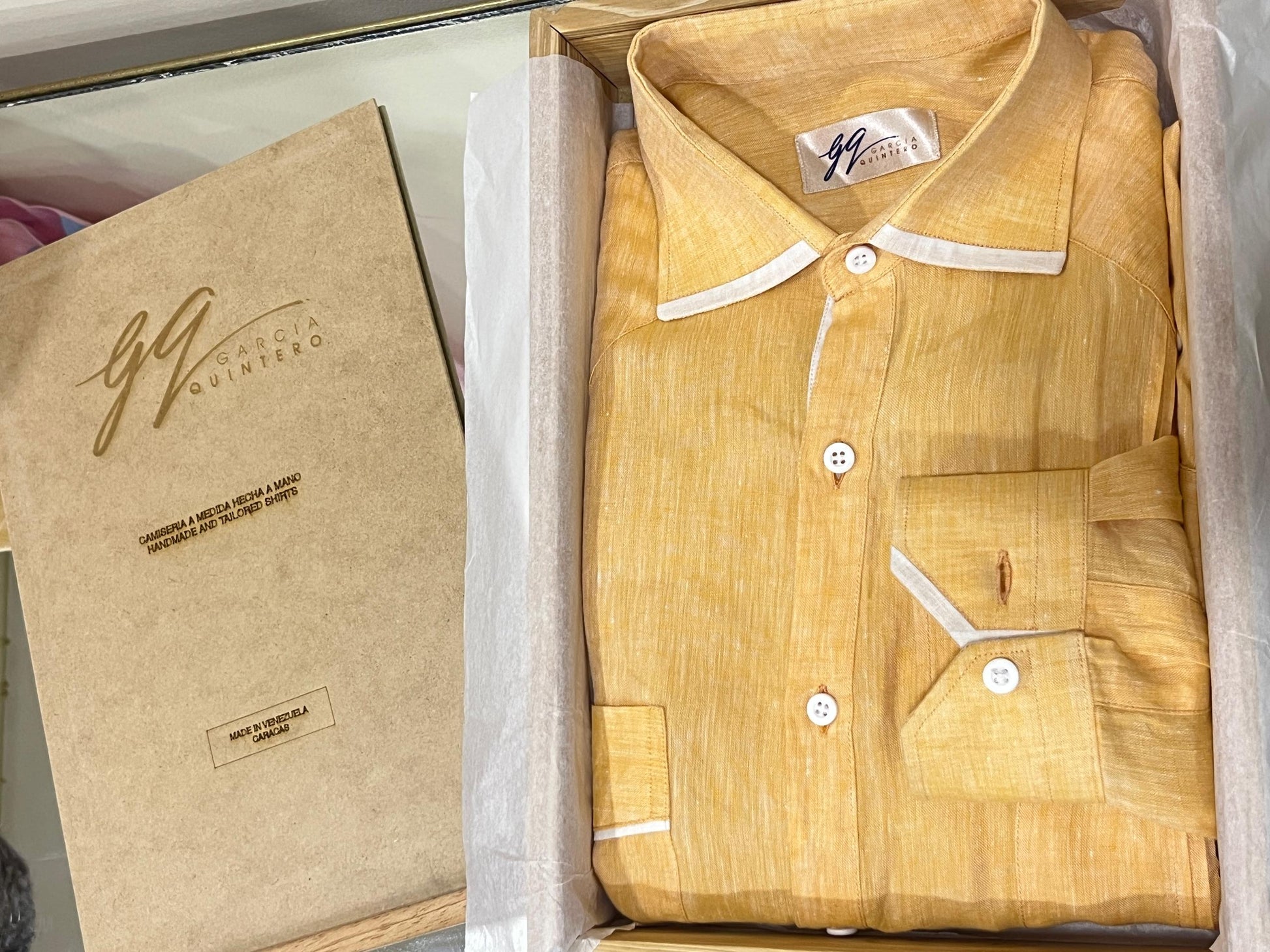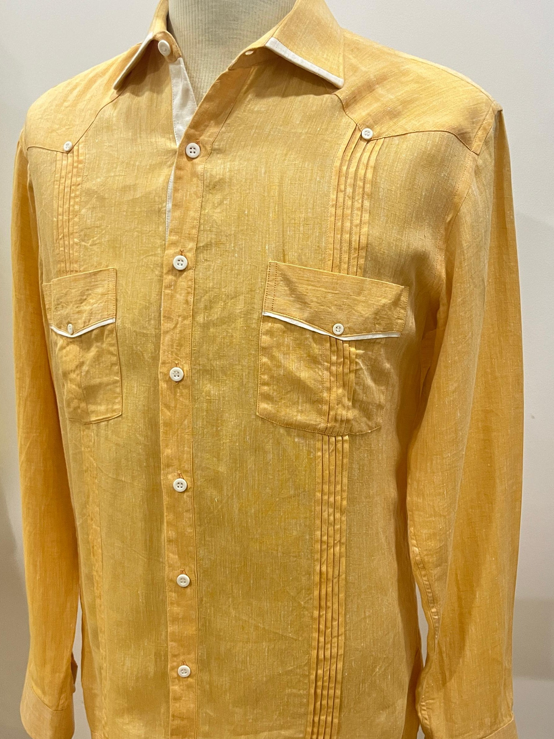 Guayabera color naranja, vivos blancos, botones blancos,puño sencillo y botones descubiertos
