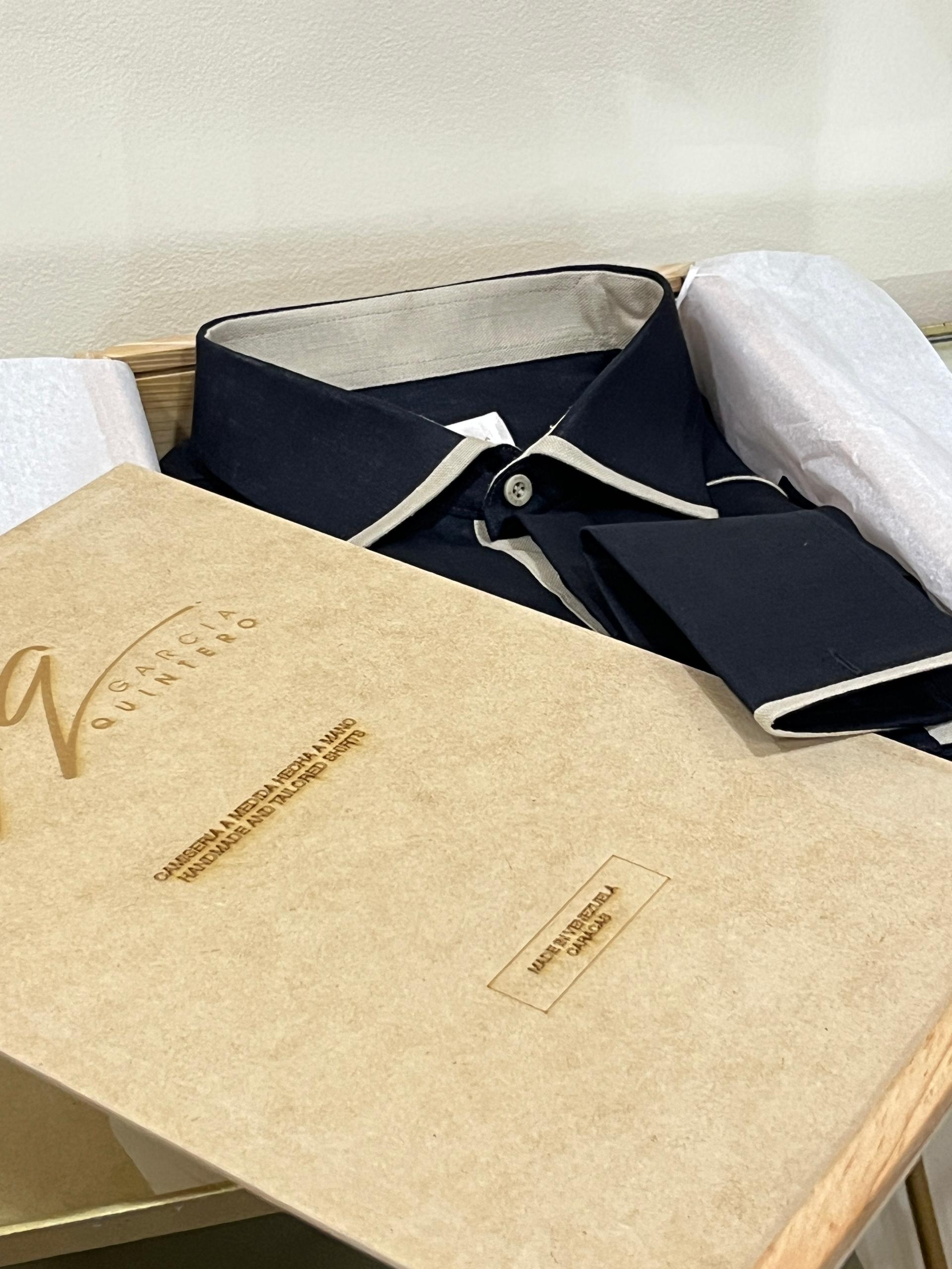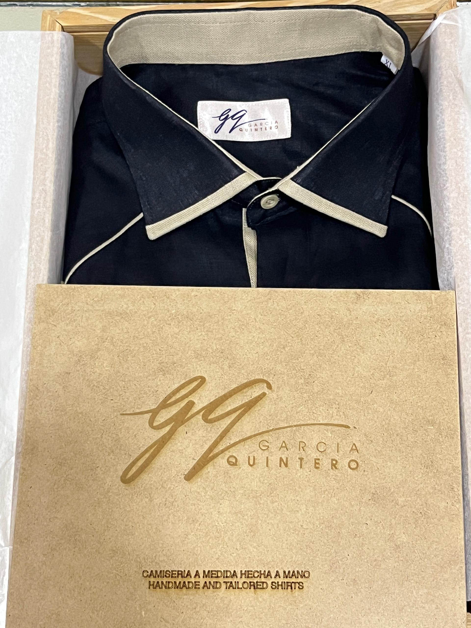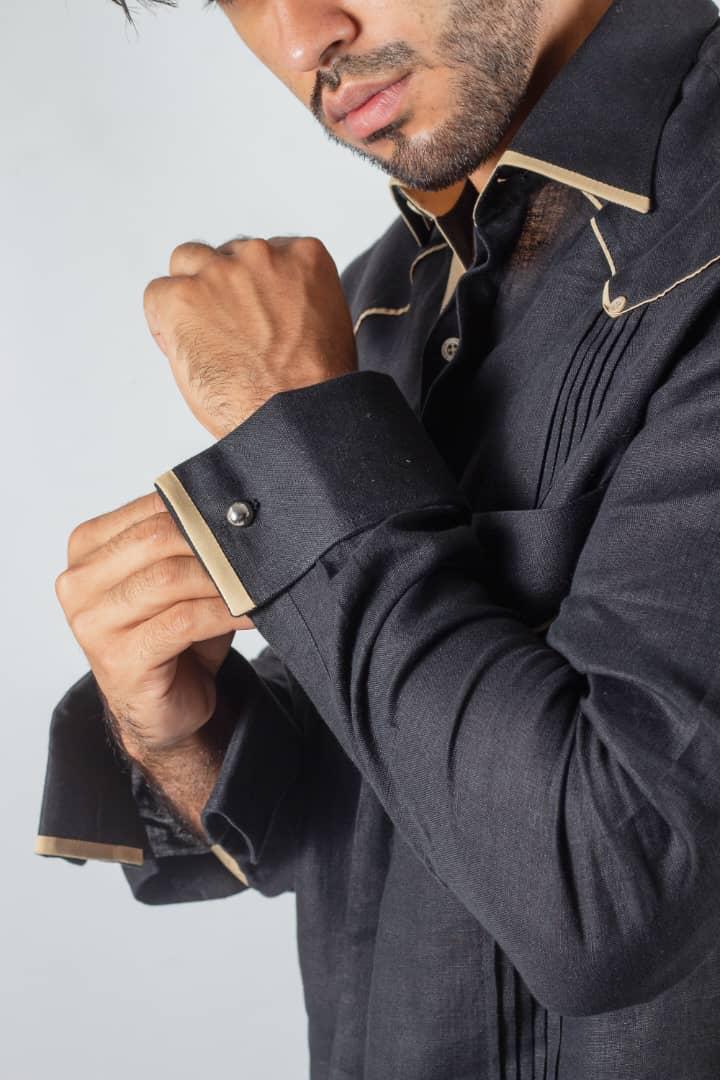 Guayabera negra, vivos beige, botones beige, doble puño y botones cubiertos