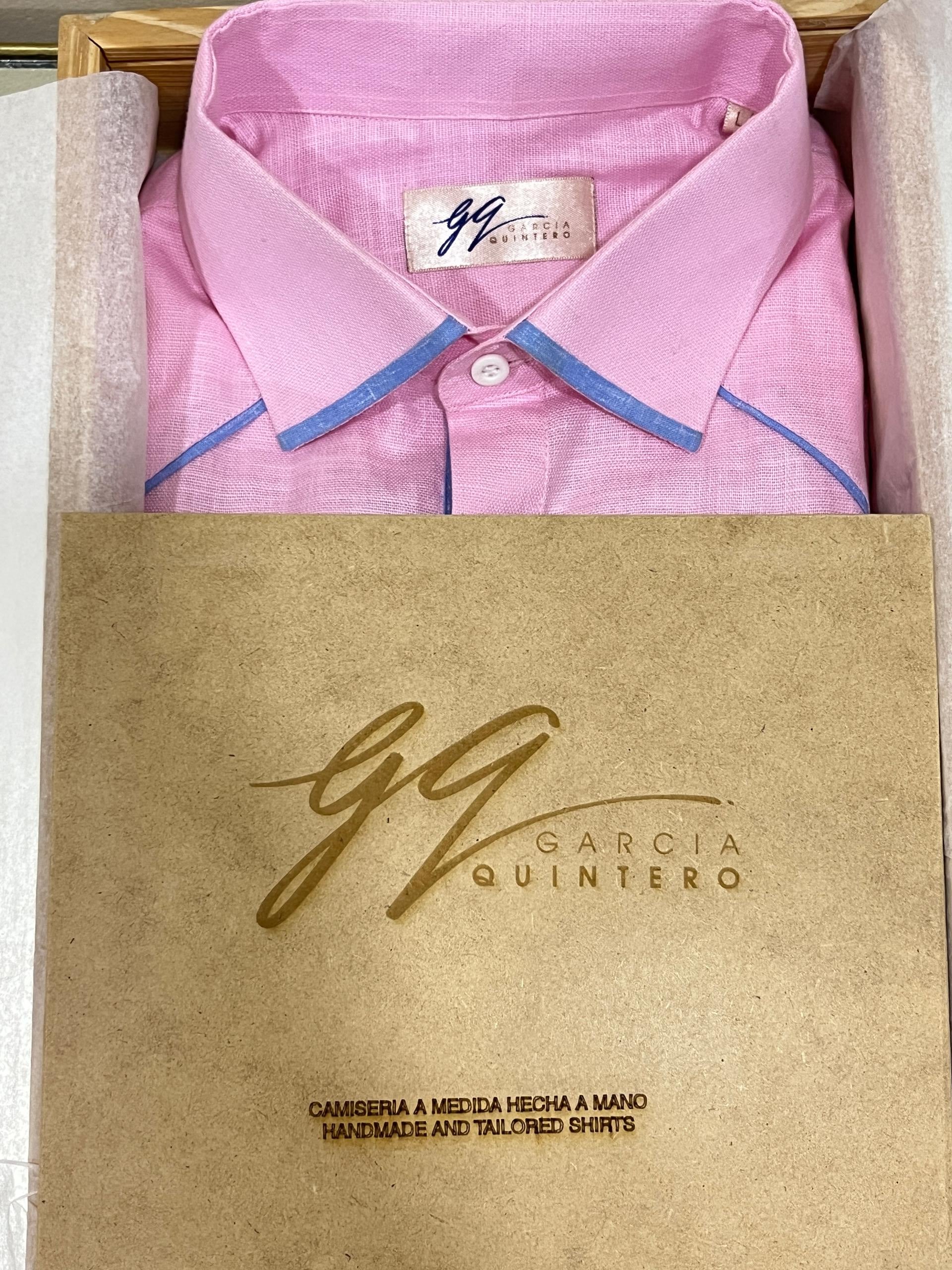 Guayabera de lino, vivos azules, botones blancos, puño sencillo y botones descubiertos