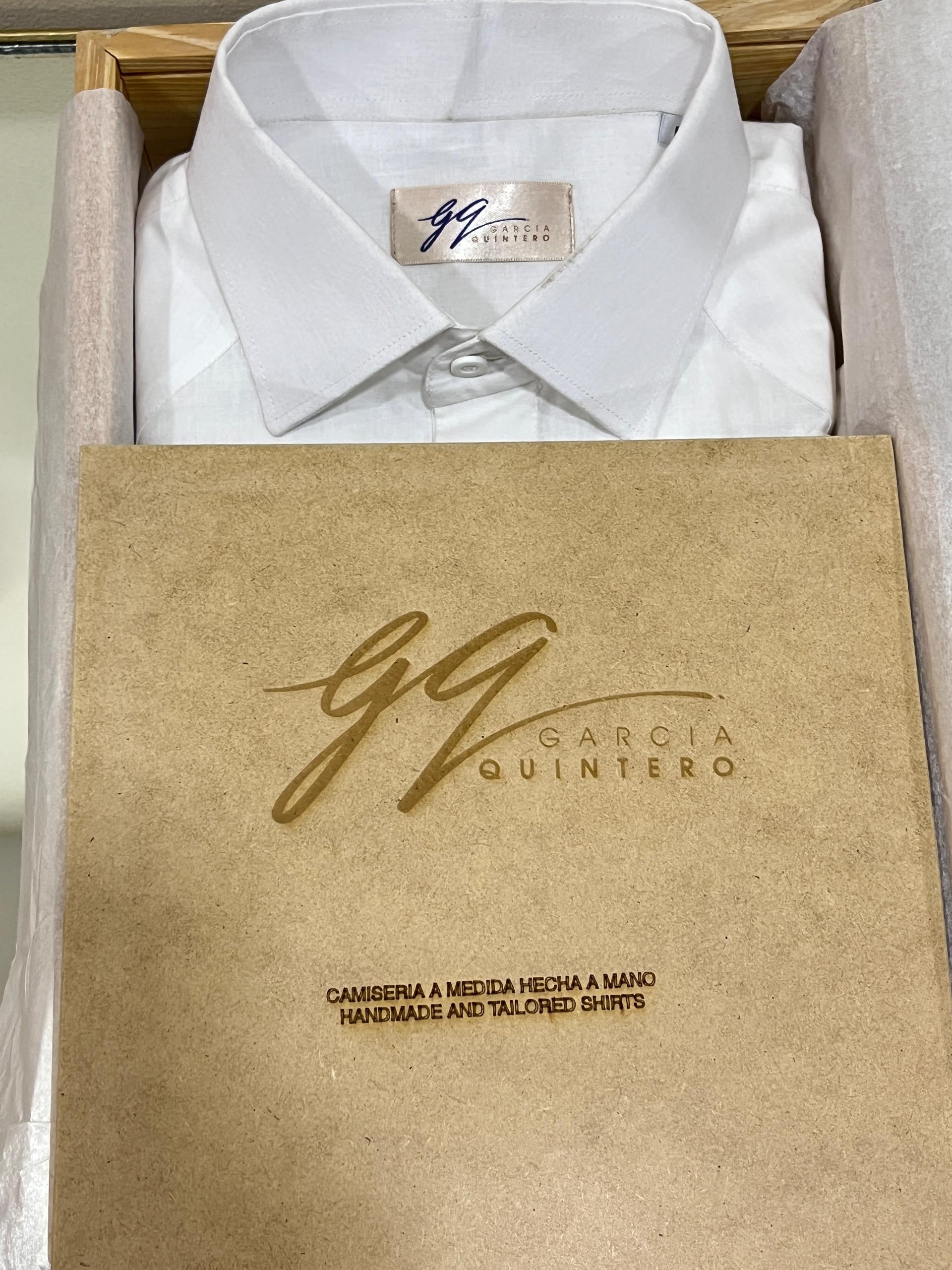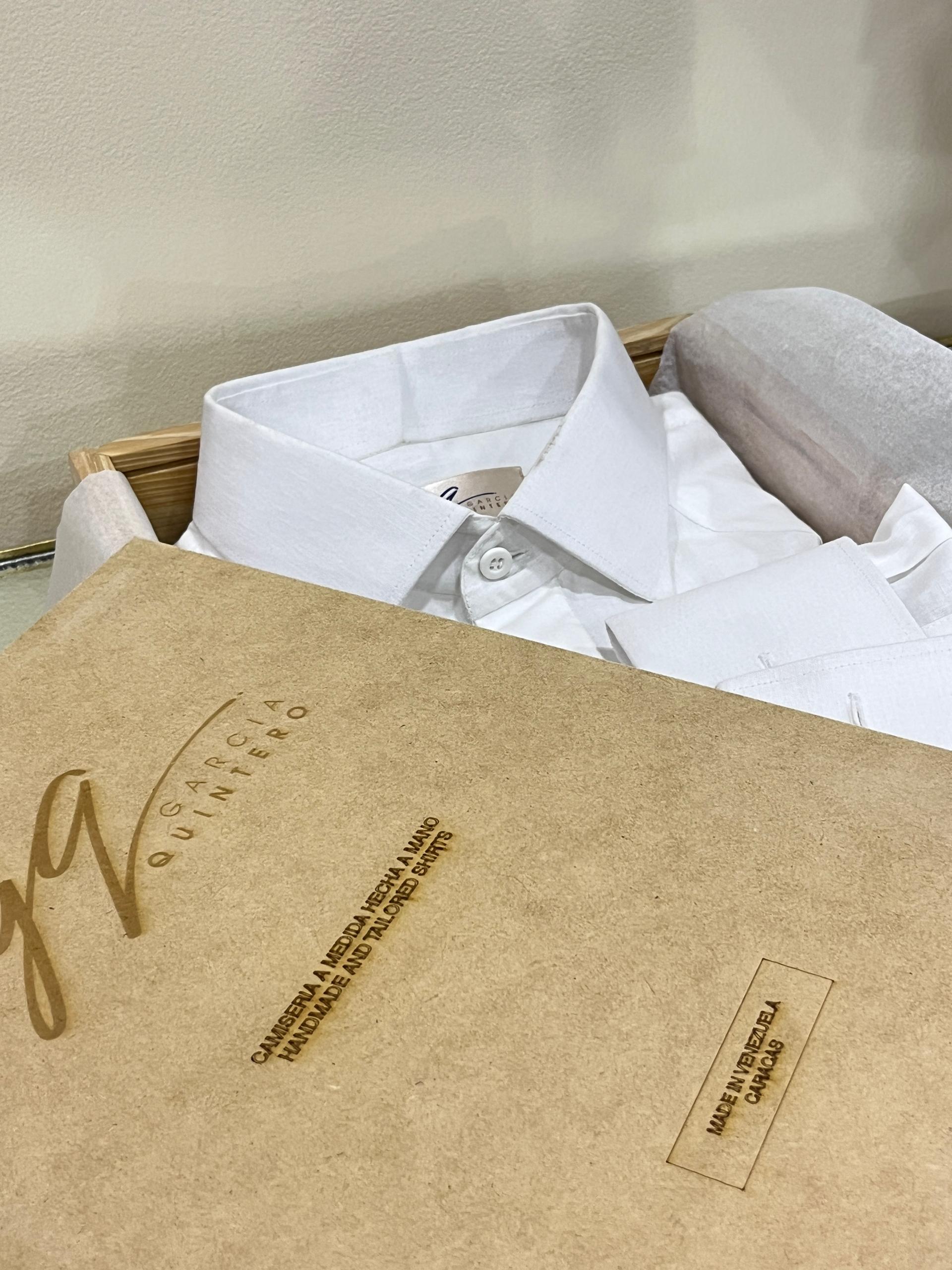 Guayabera color blanco de lino italiano, sin vivos, botones transparentes y cubiertos